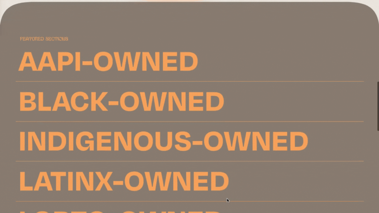 I ended up using Squarespace’s portfolio pages for these featured sections, and each featured category has a landing page listing AAPI-Owned, Black-Owned, Indigenous-Owned, Latinx-Owned, LGBT-Owned, and Sustainable businesses.