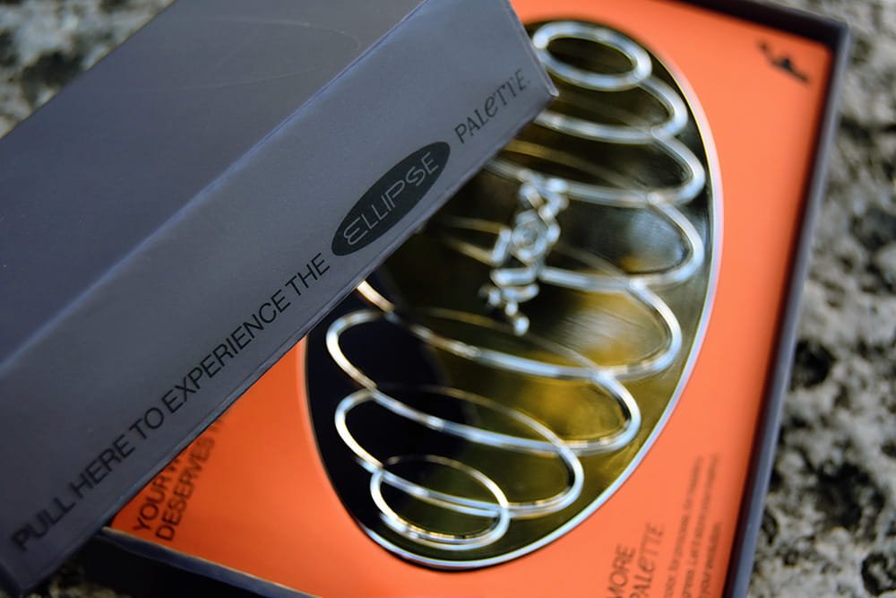 In this case, the more buttoned-up side (which still maintains a cool edge) is shown in the dark grey exterior, inspired by brutalist architecture, with embossed elements that resemble the same pattern used on the palette itself. The more brazen side is on the inside, where the user sees an explosion of the brand’s primary orange color that perfectly frames the palette’s ellipse shape.